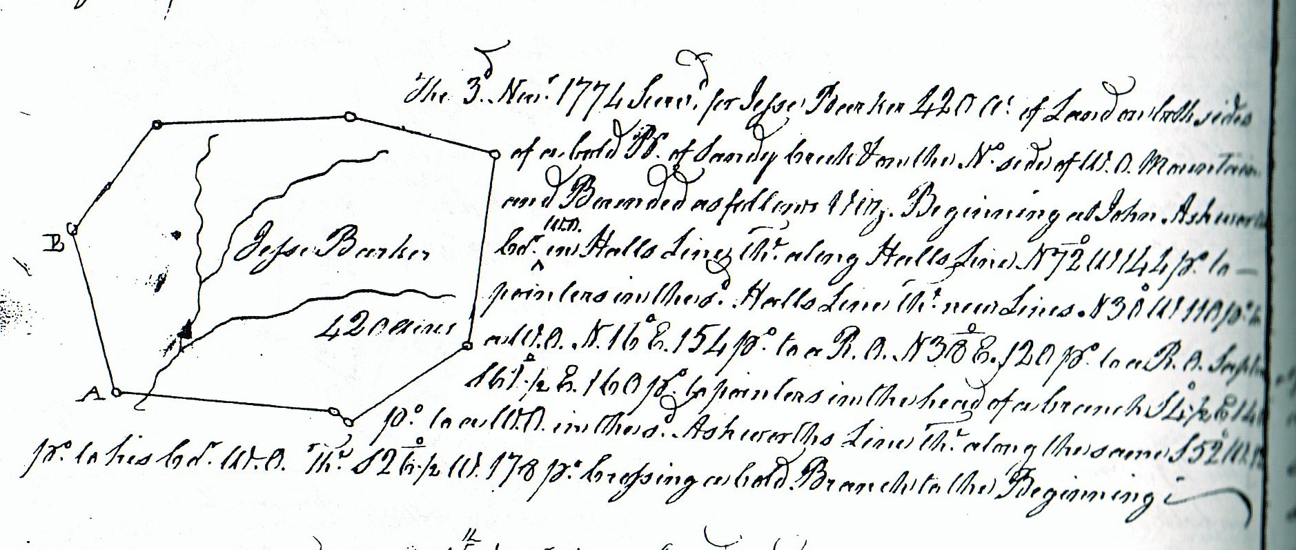 Originally surveyed in 1774 for Jesse Barker, this is the land purchased by Henry Hall in 1805. (above)