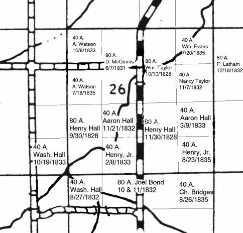 Pictured here is a plat map of several sections just south of Loami, Illinois, showing land first purchased by Henry Hall in September of 1828 and after. Other early purchases are shown including those by his sons Henry, Jr., Aaron and Washington Hall and by his daughter Nancy and her husband William Taylor. My listings include almost 4,000 individuals, almost all connected to this general area.