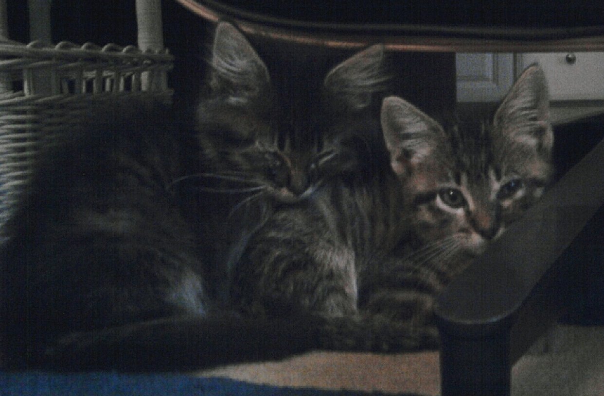 Thelma, with slightly longer hair, is on the left, and Louise on the right. They are eight weeks old here (in September, 2009). They came from the menagerie of animals at Hall Farms, south of Loami, farmed by cousins Dick and Jane Hall.